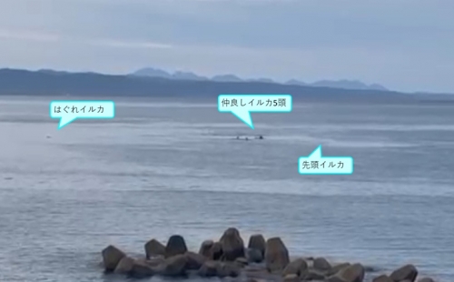んっ あれは? イルカ? うんイルカだ! それも7頭も。初めて見たので驚きと、得した気がして気分上々に。早起きは三文の徳といいますが、まさにそれです。楽しそうに集まったり一緒に飛んだりしていて、遠くへ行くまで見ていましたがホント飽きなかったです。秋になり早朝の涼しさ、そして気持ちいい風に吹かれ自然の素晴らしさを感じた一日でした。皆さんも早起きをして見つけに行ってみてはいかがですか。
